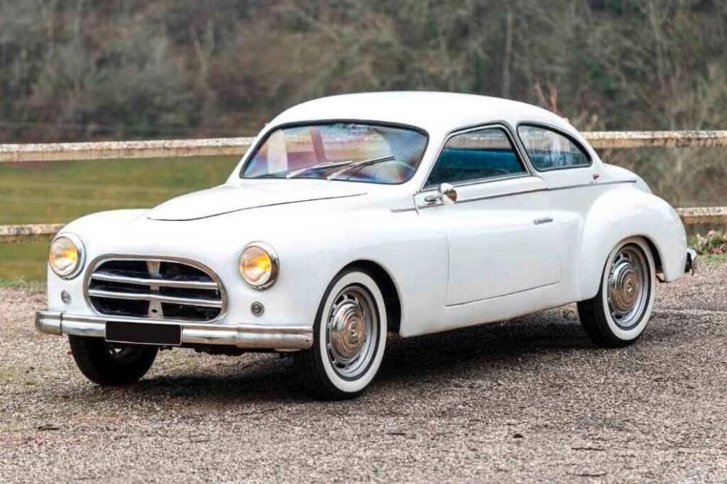A négy közül a legfeltűnőbb talán a kék Barquette, amely eredetileg 203 kabrióként látta meg a napvilágot, majd Paul Barbier autóversenyző kérésére teljesen új ruhát kapott. A karosszériát a tehetséges Roger Tunesi tervezte, a stílusát pedig a Bugattik és a DB sportautók inspirálták. A karosszéria alumíniumból készült, és mindössze 45 kilogrammot nyomott – amennyivel könnyebb lett, annyival gyorsabb is. A kis kék csoda nemcsak a francia hegyekben, hanem a legendás Mille Miglia futamon is bizonyított 1957-ben. A versenysportos múlt, a hiánytalan dokumentáció és a hibátlan állapot miatt az Aguttes szakértői 90 és 120 ezer euró közé becsülték az értékét.